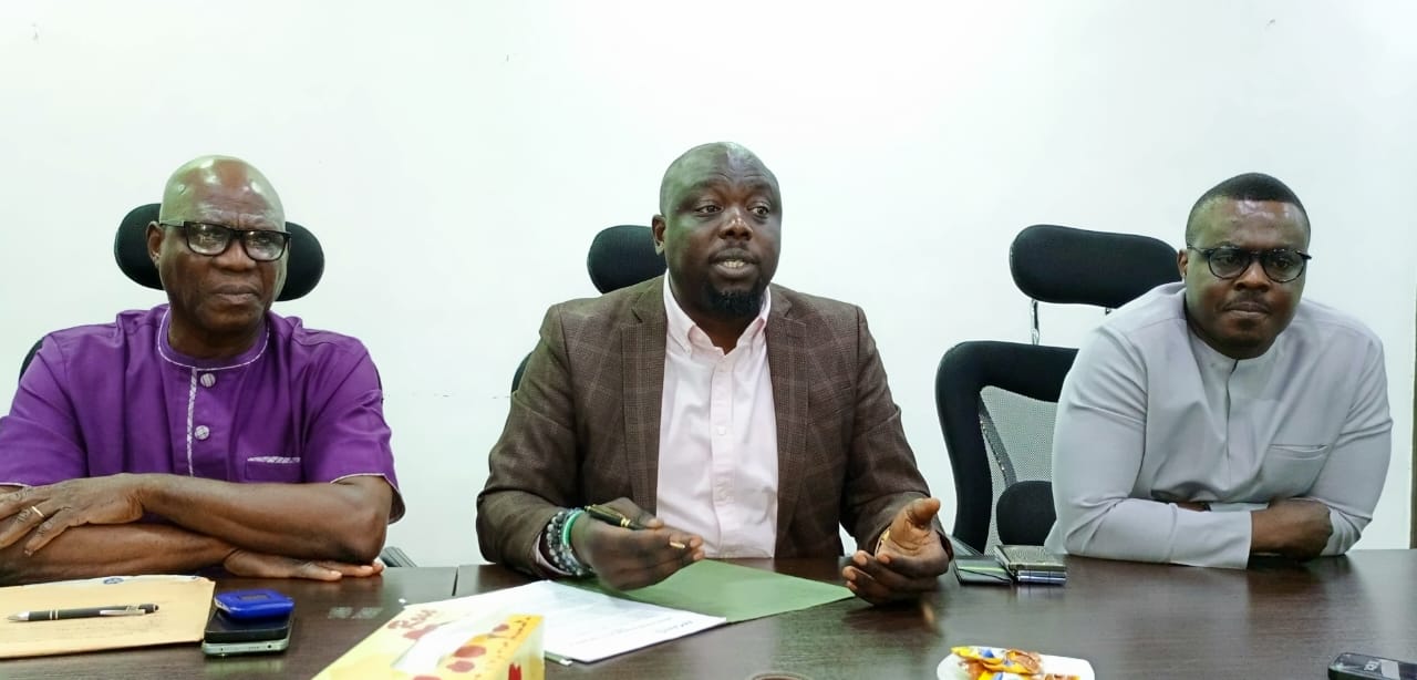 L-R: Chairman, Board of Trustees ( BoT) AMANO, Capt. Jide Olugunwa; President, AMANO, Emmanuel Maiguwa and Secretary, Capt. Garba Gajere, during a press conference in Lagos on Tuesday.