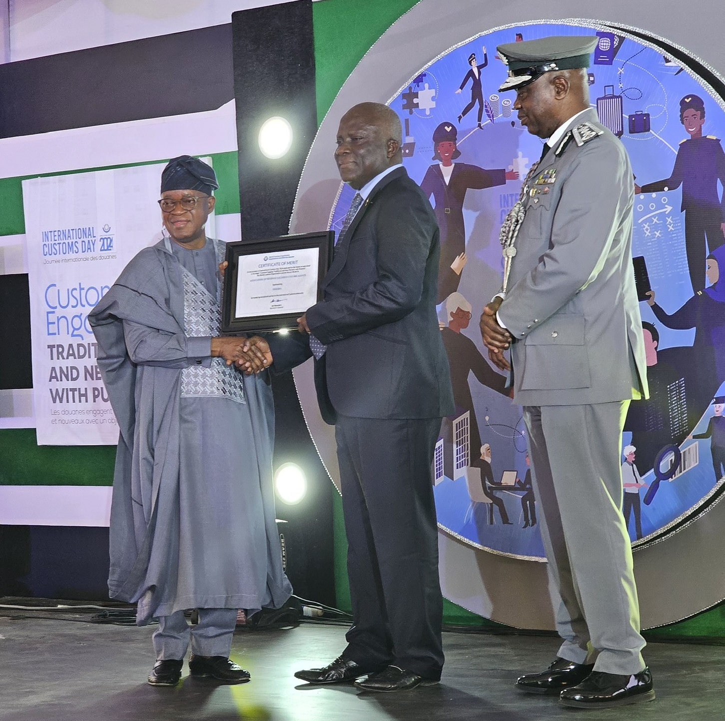 Minister of Marine and Blue Economy, Adegboyega Oyetola, presenting the WCO award to ANLCA President, Mr. Emenike Nwokeoji, supported by the Comptroller General of Customs, Adewale Adeniyi, during the occasion of the 2024 International Customs Day in Lagos on Friday.
