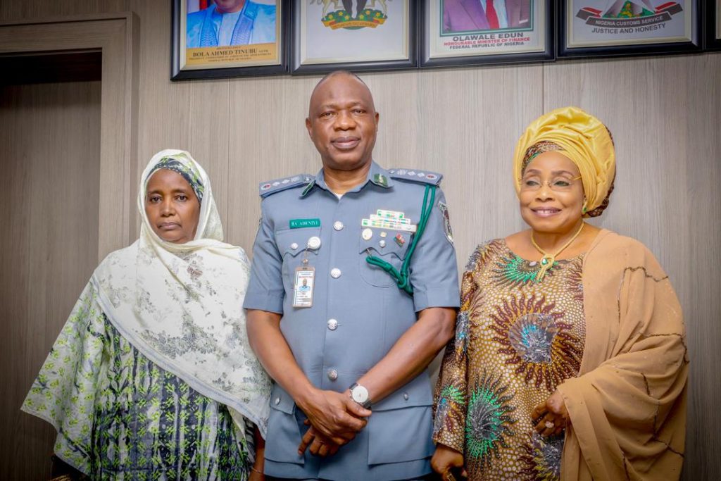L-R: Director General, National Agency for the Prohibition of Trafficking in Persons (NAPTIP) Hajia Binta Adamu, Comptroller-General of Customs, Adewale Adeniyi, and BoT member, MMS WoFHoF Initiative, Hajia Lami Tumaka during a courtesy visit to Customs Headquarters, Abuja on Tuesday.