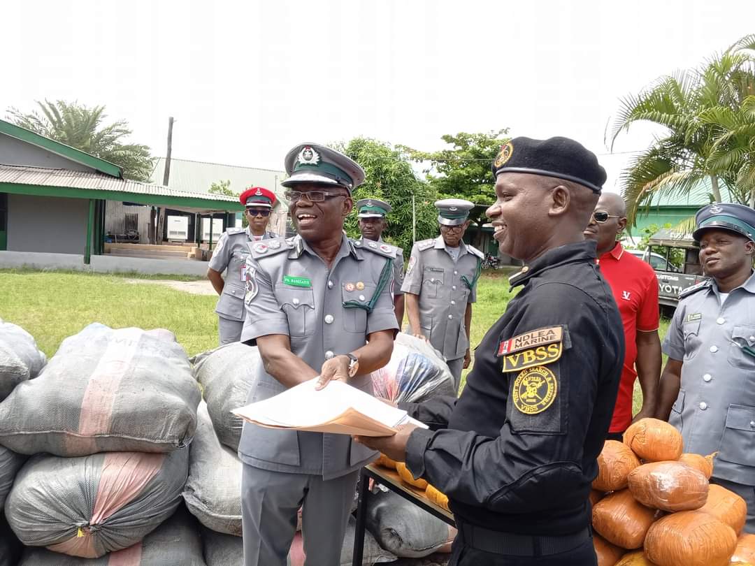 “In the spirit of interagency synergy and collaboration in line with the Comptroller General’s (CGC) policy thrust, the Western Marine Command (WMC) under my leadership has received approval to handover 17 sacks containing 1,257 loaves of cannabis sativa which includes 72 loaves that were previously seized by the Command with a combined weight of 609kg worth over 96million to the National Drug Law Enforcement Agency (NDLEA), ” he said.