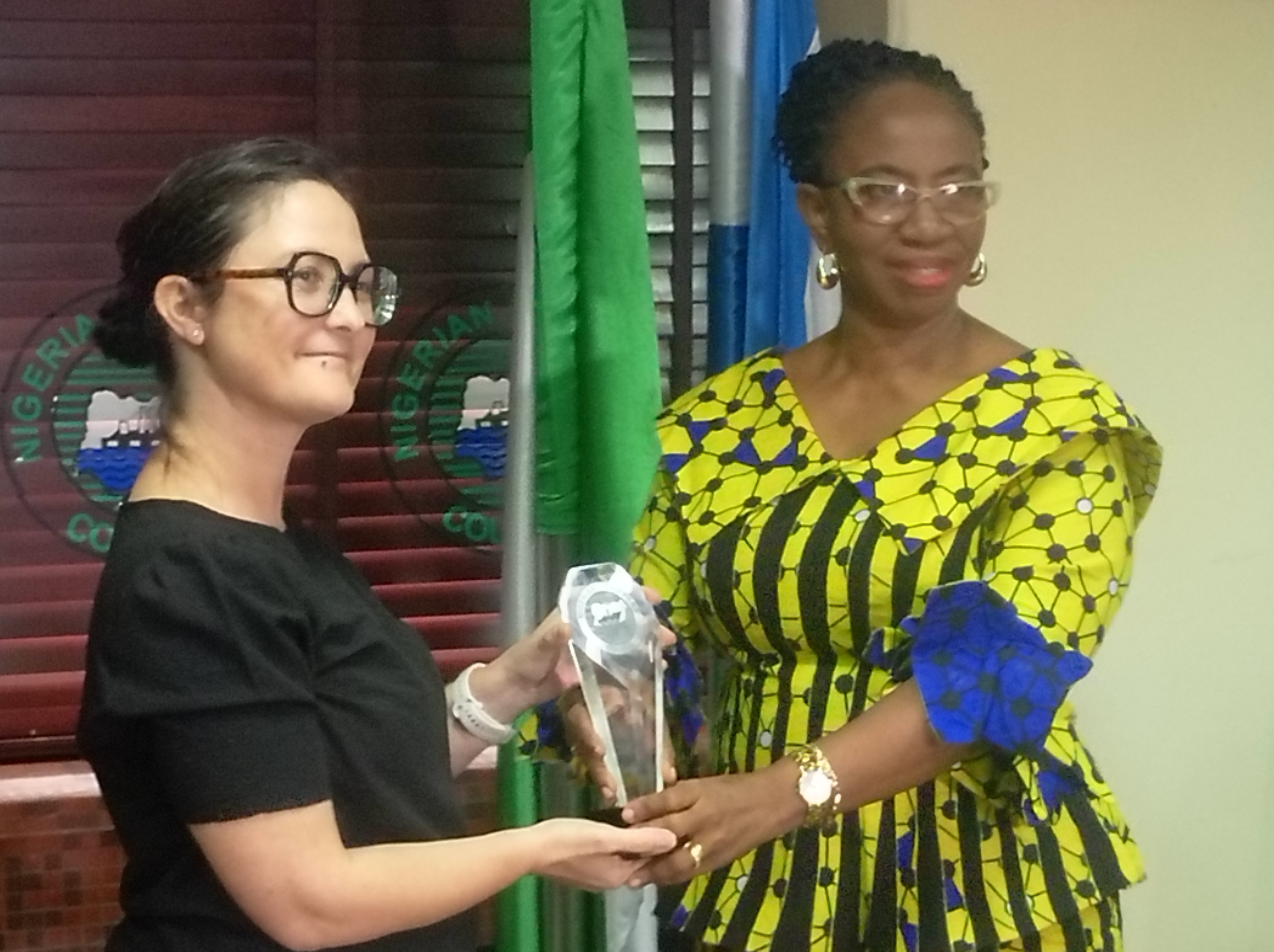 The Director, Human Resources, Nigerian Shippers’ Council (NSC), Mrs. Ada Okam ( right) presenting a plaque to the Head of the European Union delegation, Celine Lhoste, during a visit to the NSC headquarters in Lagos on Monday.