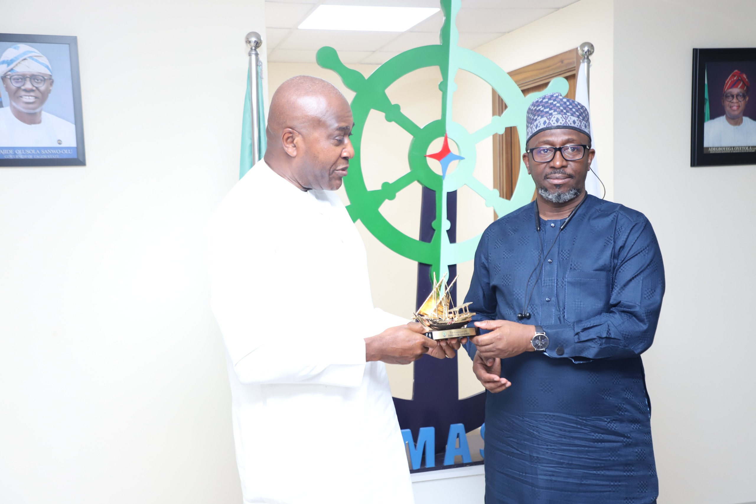 Executive Director of Finance and Administration at the Nigerian Maritime Administration and Safety Agency (NIMASA), Chudi Offodile (left), presenting a souvenir to Chairman of the House of Representatives Committee on Safety Standards and Regulations, Hon. Abubakar Sulaiman, during an oversight visit to the Agency’s headquarters in Lagos.