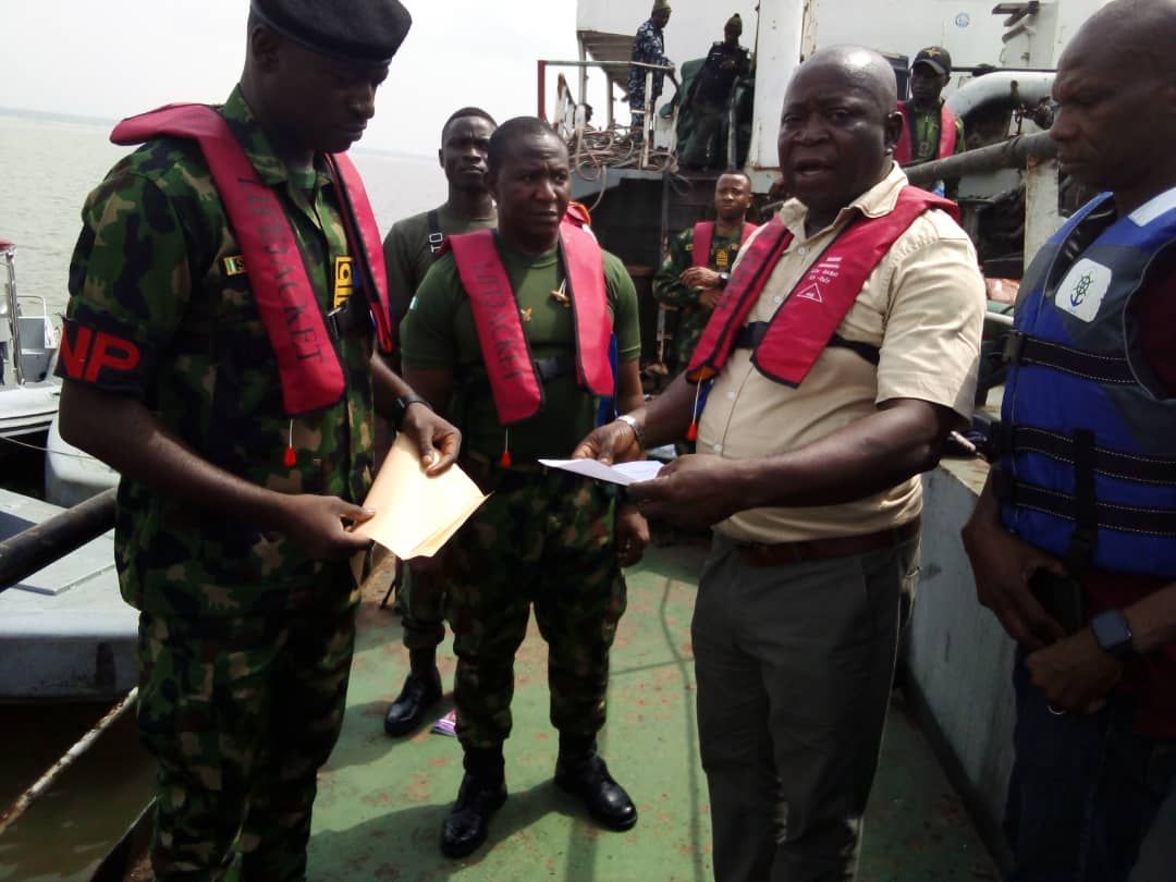 Base Operation Officer of the Nigerian Navy Ship, Delta (NNS, DELTA) Commander Samuel Musa handing over MT Sea Eunice to the District Surveyor, Central Zone of NIMASA, Engr. Joshua Oyadiran in Warri, Delta State.