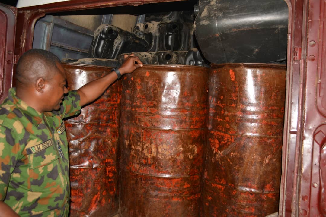 Commodore Oladejo detailed the contents of the illegal fuel depot, which included 8 storage tanks of 50,000 litres capacity each, laden with about 57,000 litres of AGO; a Tanker laden with about 7,000 litres; a Bus with 30 jerry cans laden with about 1,500 litres. The total products discovered is about 65,000 litres of AGO valued at an estimated N89 lmillion based on the current price of