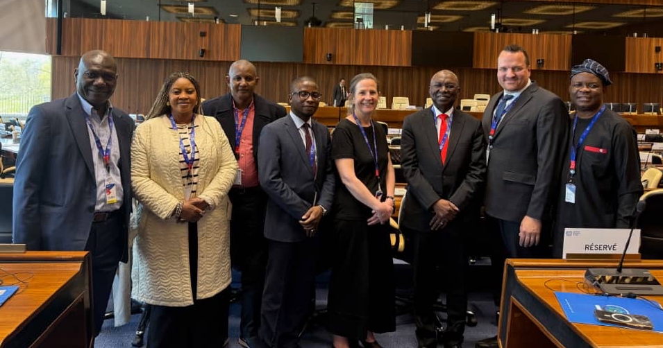 L-R: Regional Advisor and ILO Expert, Dr Amos Kuje; Head, Internal Audit, Nigerian Maritime Administration and Safety Agency, NIMASA, Dr Odunayo Ani; Deputy Director Maritime Labour Services, Yusuf Barde; Executive Director, Maritime Labour and Cabotage Services, NIMASA, Jibril Abba; Director General, NIMASA, Dr Dayo Mobereola (3rd right) and other delegates, at the 5th ILO Special Tripartite Committee Meeting in Geneva, Switzerland.