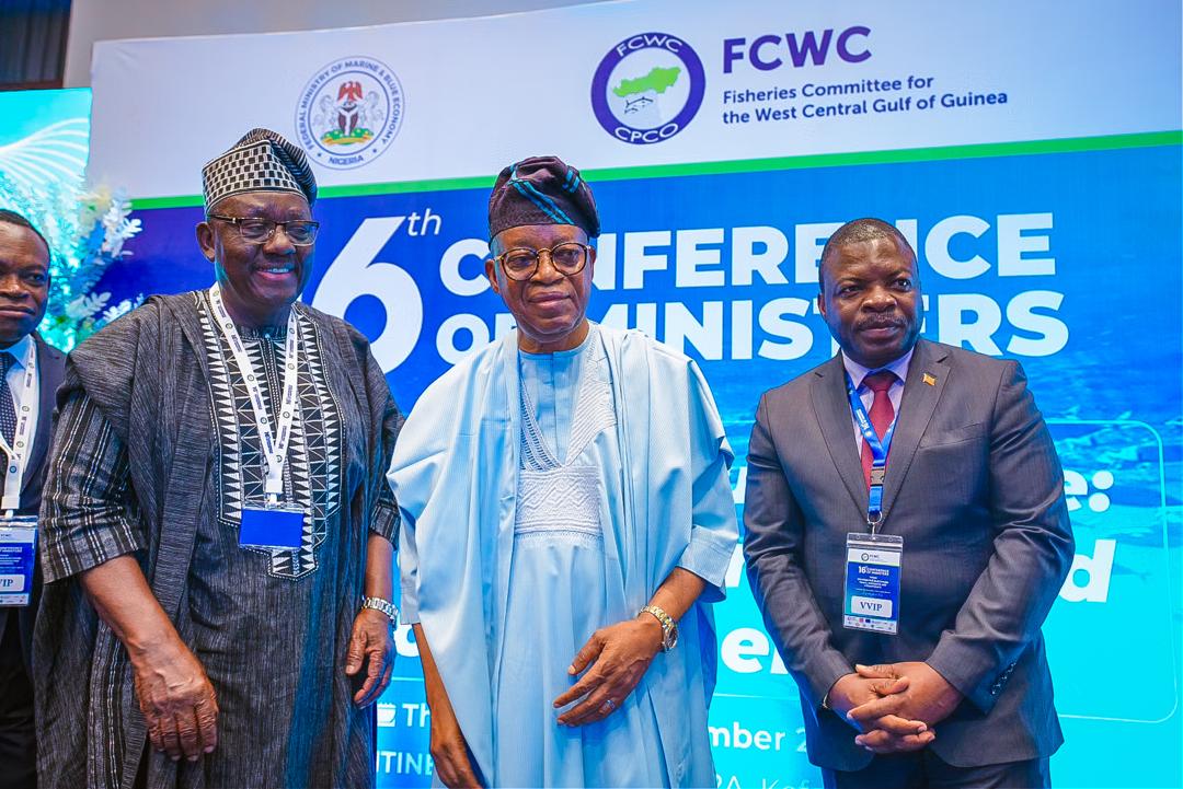 L-R: Benin Republic’s Minister of Agriculture, Livestock and Fisheries, Mr Gaston Dossouhoui; Nigeria’s Minister of Marine and Blue Economy, Dr Adegboyega Oyetola (CON) and former Chairman of the Conference of Ministers of the Fisheries Committee for the West Central Gulf of Guinea (FCWC), Mr Cyrus Saygbe Sr, at the 16th Conference of Ministers of the FCWC in Victoria Island, Lagos, on Thursday.
