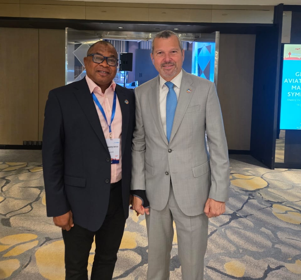 Managing Director, NIWA, Mr. Bola Oyebamiji (left) and the Secretary General, International Maritime Organisation ( IMO) Mr Arsenio Dominquez at the global Maritime and Aviation symposium in Singapore on Monday.