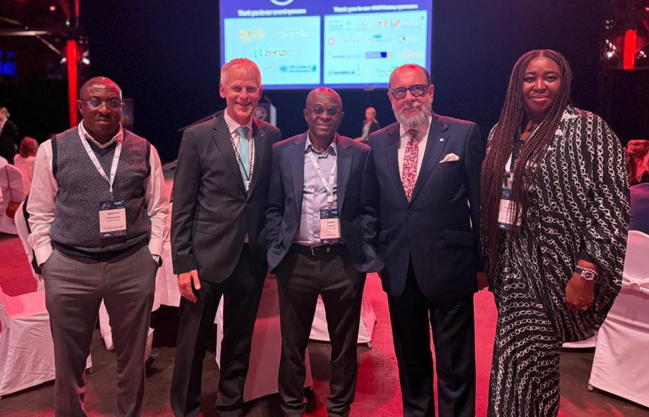 Managing Director, Nigerian Ports Authority (NPA) Dr. Abubakar Dantsoho (middle), President of the International Association of Ports and Harbors (IAPH) and CEO of Hamburg Port Authority Jens Meier (2nd Left), Managing Director IAPH, Mr. Patrick Verhoeven (2nd Right), Executive Director Finance & Administration, NPA Ms. Vivian Richard Edet (1st Right) and Mr. Ikechukwu Onyemekara, General Manager Corporate & Strategic Communications NPA (1st Left) at the International Association for Ports & Harbours World Port Conference 2024 in Hamburg – Germany.