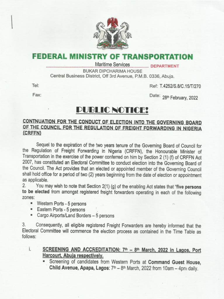 The notice reads, “Sequel to the expiration of the two years tenure of the Governing Board of Council for the Regulation of Freight Forwarding in Nigeria (CRFFN), the Honourable Minister of Transportation in the exercise of the power conferred on him by Section 2 (1) (f) of CRFFN Act 2007, has constituted an Electoral Committee to conduct election into the Governing Board of the Council. The Act provides that an elected or appointed member of the Governing Council shall hold office for a period of two (2) years beginning from the date of election or appointment as applicable.