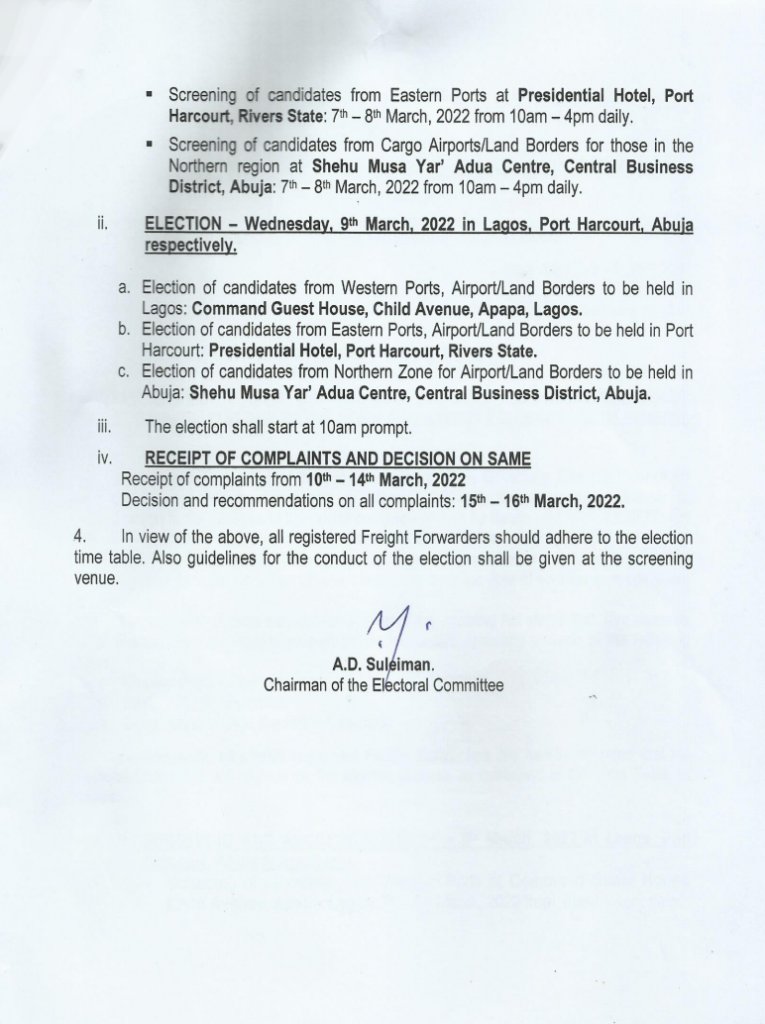 4. In view of the above, all registered Freight Forwarders should adhere to the election time table. Also, guidelines for the conduct of the election shall be given at the screening venue.