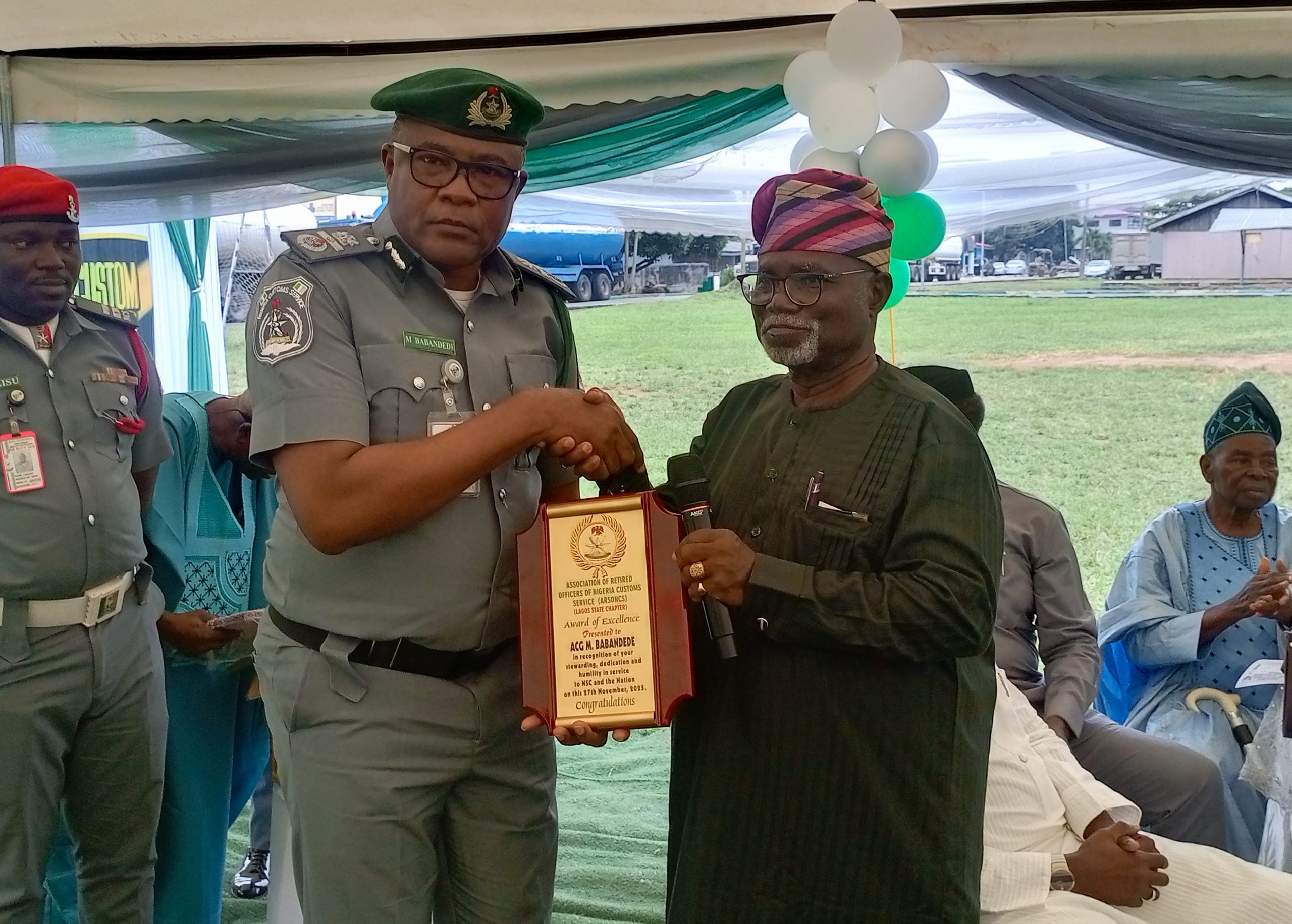 ACG Muhammed Babandede receiving an award from ACG Jejelaiye Afolayan ( Rtd) in recognition of his dedication to Service at the Customs’ Retirees End-of-Year party in Lagos on Thursday.