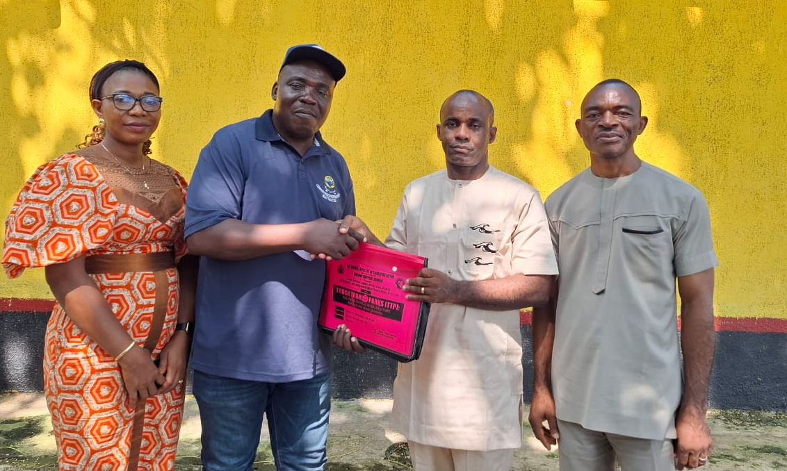Immediate past President, Shipping Correspondents’ Association of Nigeria (SCAN), Eugene Agha (second left), handing over to the new President, Moses Ebosele; Vice President, Tony Nwachukwu (right), and General Secretary, Shulammite Olowofoyeku (left) after their election in Lagos on Friday.