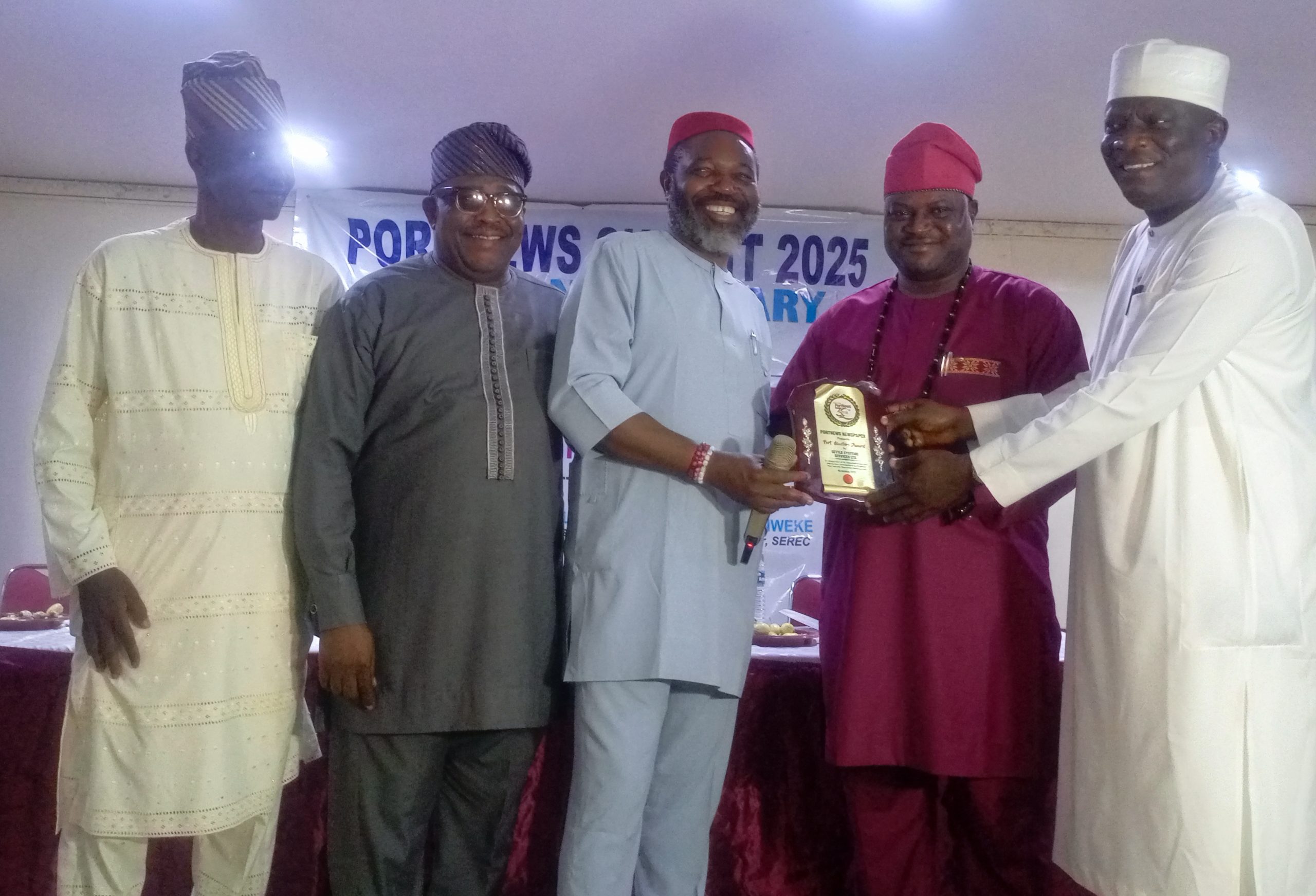 L:R- Publisher and Editor in Chief of Port News, Wale Oni; representative of Skelas Group, Bolade Oladipo; Head of Research, Sea Empowerment and Research Centre, Dr. Eugene Nweke; Secretary, ANLCA Tin can Island Port Chapter, Barr. Ovien Micheal and Senior Special Adviser on media to ANLCA President, Ayokunle Sulaimon receiving the Port Master Award on behalf of Settle Systems Limited at the Port News 30th anniversary celebration in Lagos on Thursday.