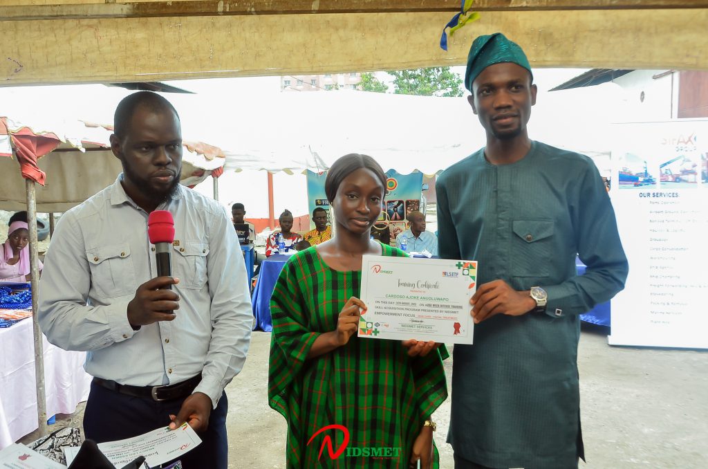 L- R: Mr. Oluwole Fabiyi, Managing Director, NIDSMET Skill Acquisition Programme; A 2025 Graduand of NIDSMET, Cardoso Ajoke Anuoluwapo and SIFAX Group Media Officer, Olatunde Adewola (Representing SIFAX Group Head Corporate Communications) during the certificate presentation to Graduands of the 2025 edition of the NIDSMET Skill Acquisition Programme held in Lagos recently.