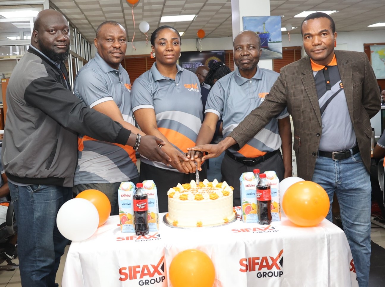 L-R: SIFAX Group’s Head of Admin, Mr. Jalade Omotayo; SIFAX Group’s Deputy Director, Strategy and Operations, Oliver Omajuwa; SIFAX Group’s Head of Marketing & Customer Service, Catherine Abuah; Special Assistant to the Chairman, Barr. Ezekiel Ajewole and SIFAX Group’s Head of Audit, Mr Olusola Akinbote cutting the cake at the grand finale of the 2025 Customers Service Week held on Friday at the Group’s head office in Lagos.