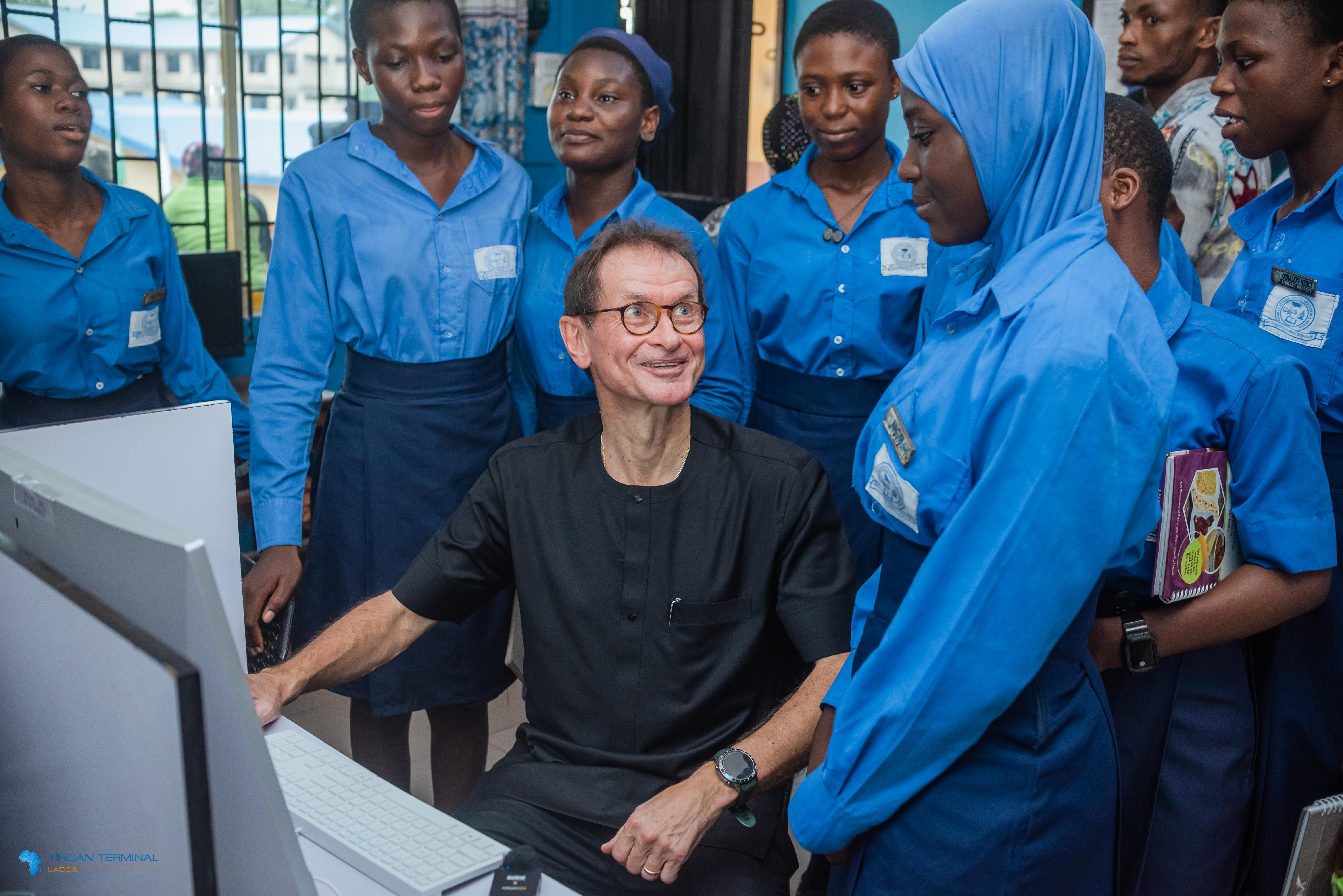 Etienne Rocher, Country Managing Director, AGL (Tincan Island Container Terminal); surrounded by students at Randle Senior Secondary School, Apapa during the official commissioning and handing over of upgraded infrastructure. The event was held at the school premises, Apapa.